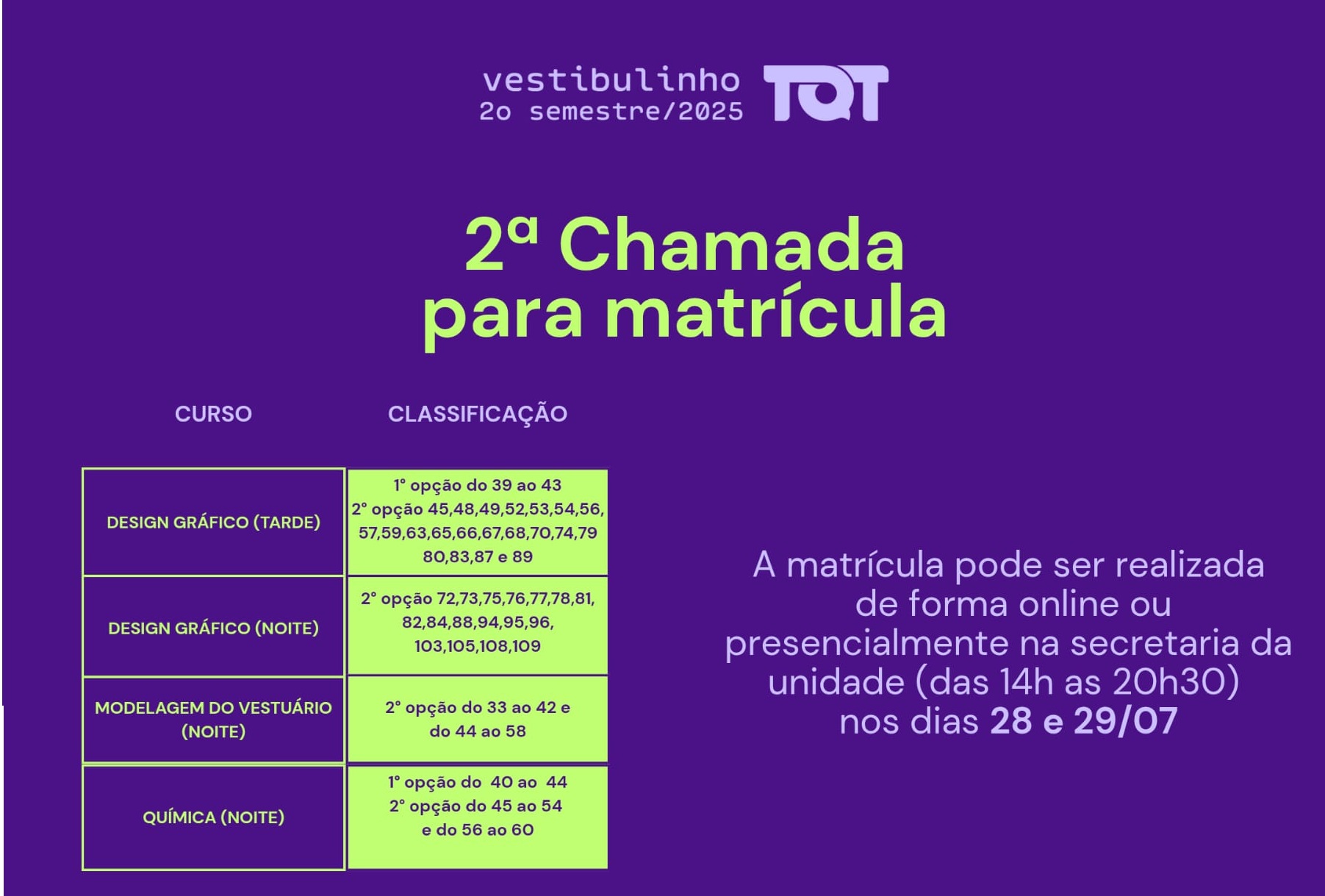 📍 Presencialmente: na secretaria da unidade, das 14h às 20h30