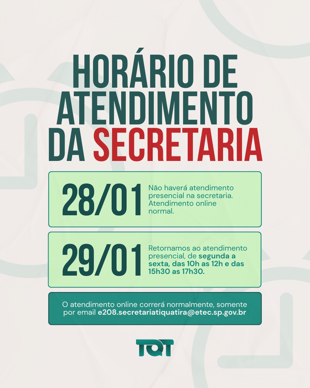 Atendimento da secretaria nos dias 28 e 29/01