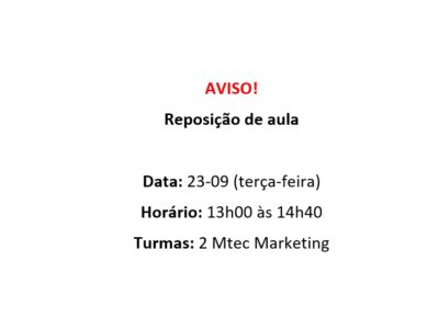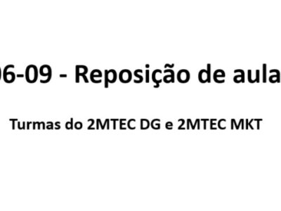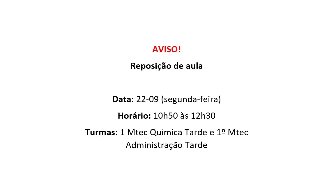 No dia 22-09 teremos a reposição de aulas com as turmas do 1 Mtec Química Tarde e 1 Mtec Administração Tarde, das 10h50 às 12h30.